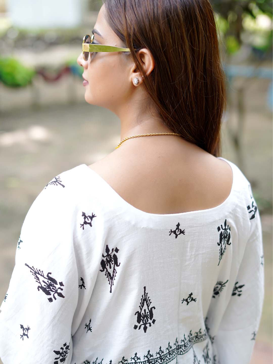 The print is made using the same color tones creating a subtle and elegant effect. Backless design with a dori (tie) at the back, adding a stylish and feminine touch. This kurti can be worn for daily casual wear or semi-formal occasions due to its comfortable fabric and chic look.