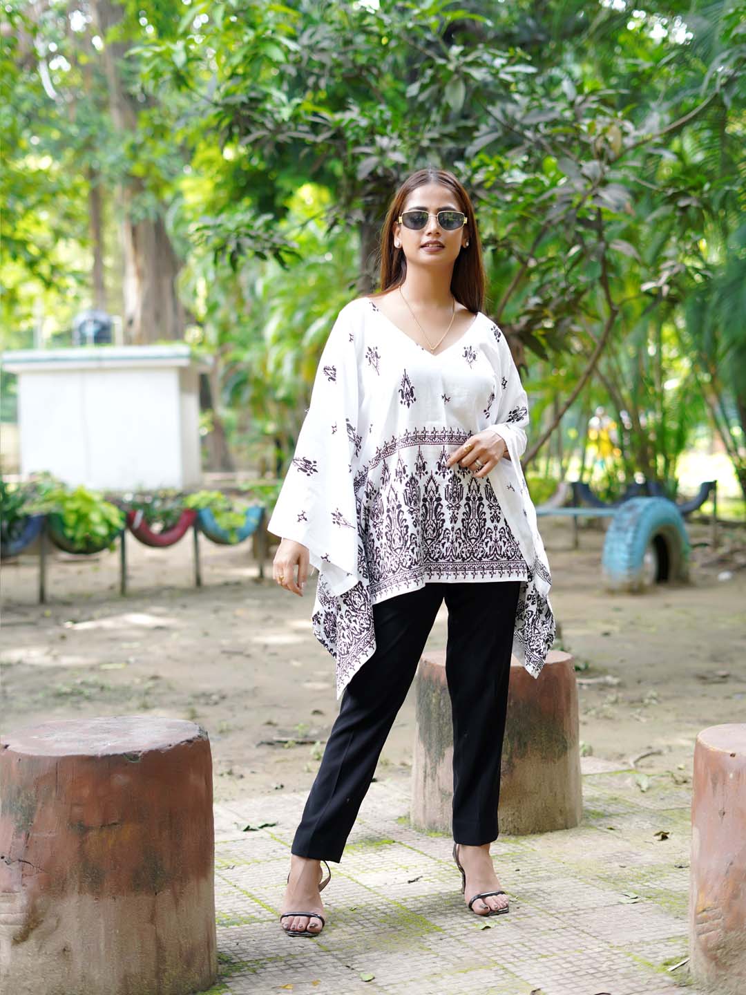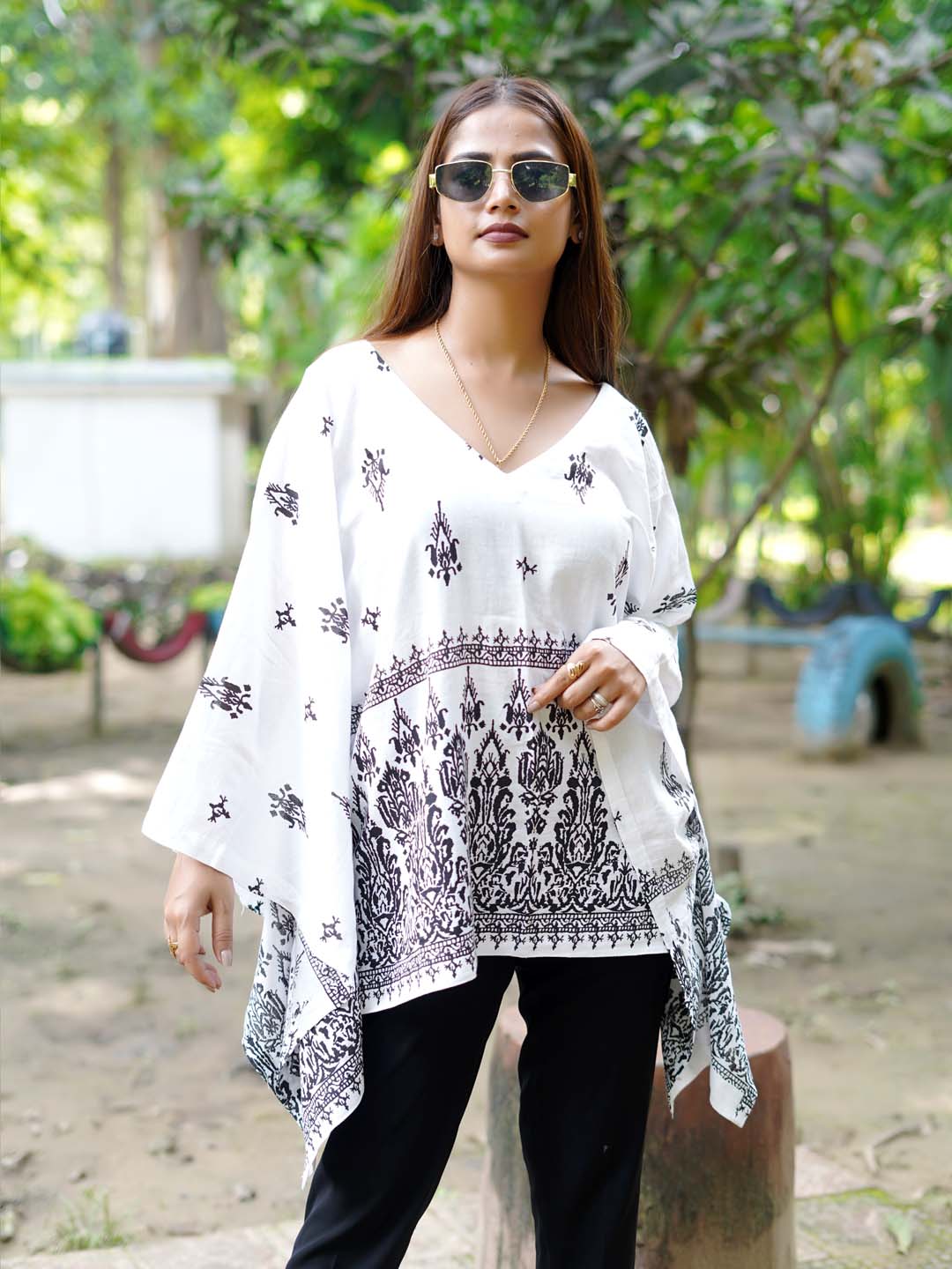Enhance your wardrobe with our new stylish and elegant kaftan kurti featuring a striking black and white ethnic print that brings an ethnic charm to the outfit. The kurti has a V-shaped neckline, adding a contemporary and flattering touch to the traditional kaftan silhouette. The print usually consists of ethnic motifs or geometric patterns that enhance its cultural and aesthetic appeal.