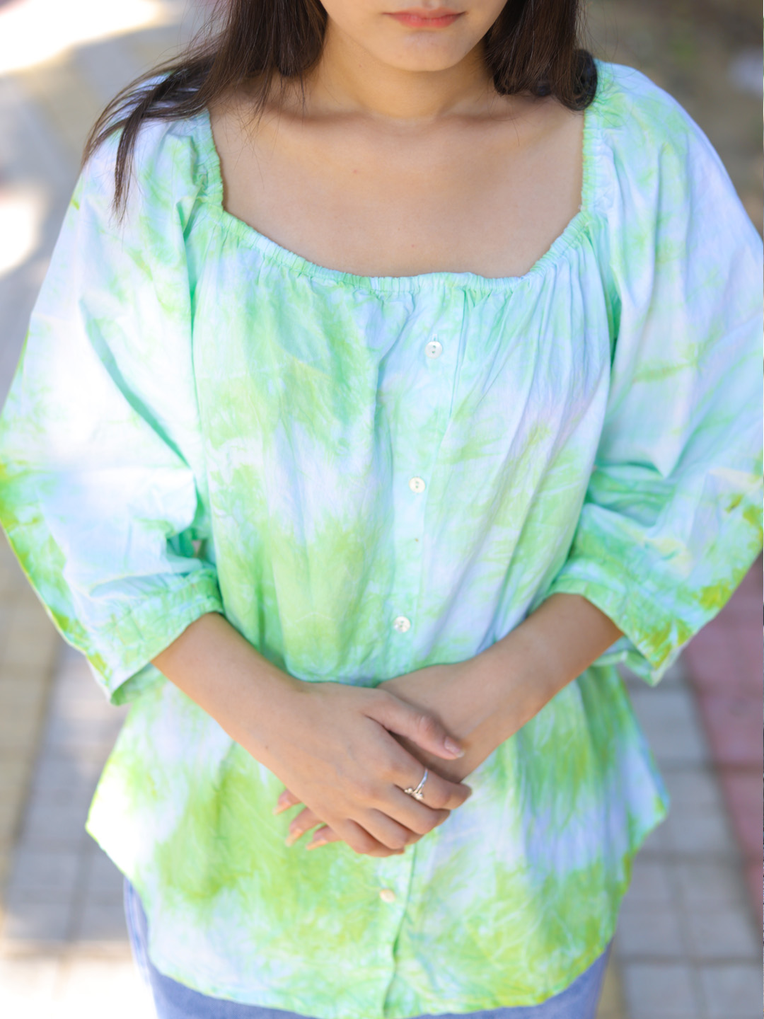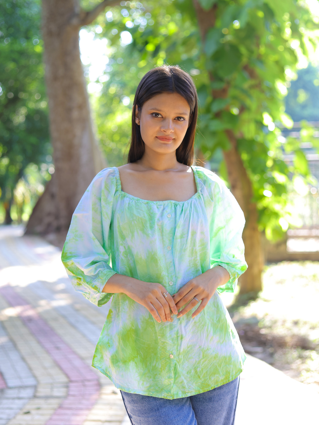 Charu is a chic tie & dye print top featuring an adjustable off-shoulder neckline and stylish balloon sleeves, perfect for a breezy, boho-inspired look.
