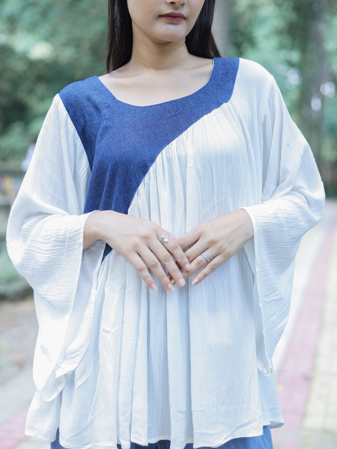 “Introducing Denim Mist – a refreshing fusion of soft off-white and bold denim blue. This flowy top features a geometric yoke and wide sleeves, delivering modern sophistication and all-day comfort. Best styled with denims or ethnic separates for a breezy, elegant look.”