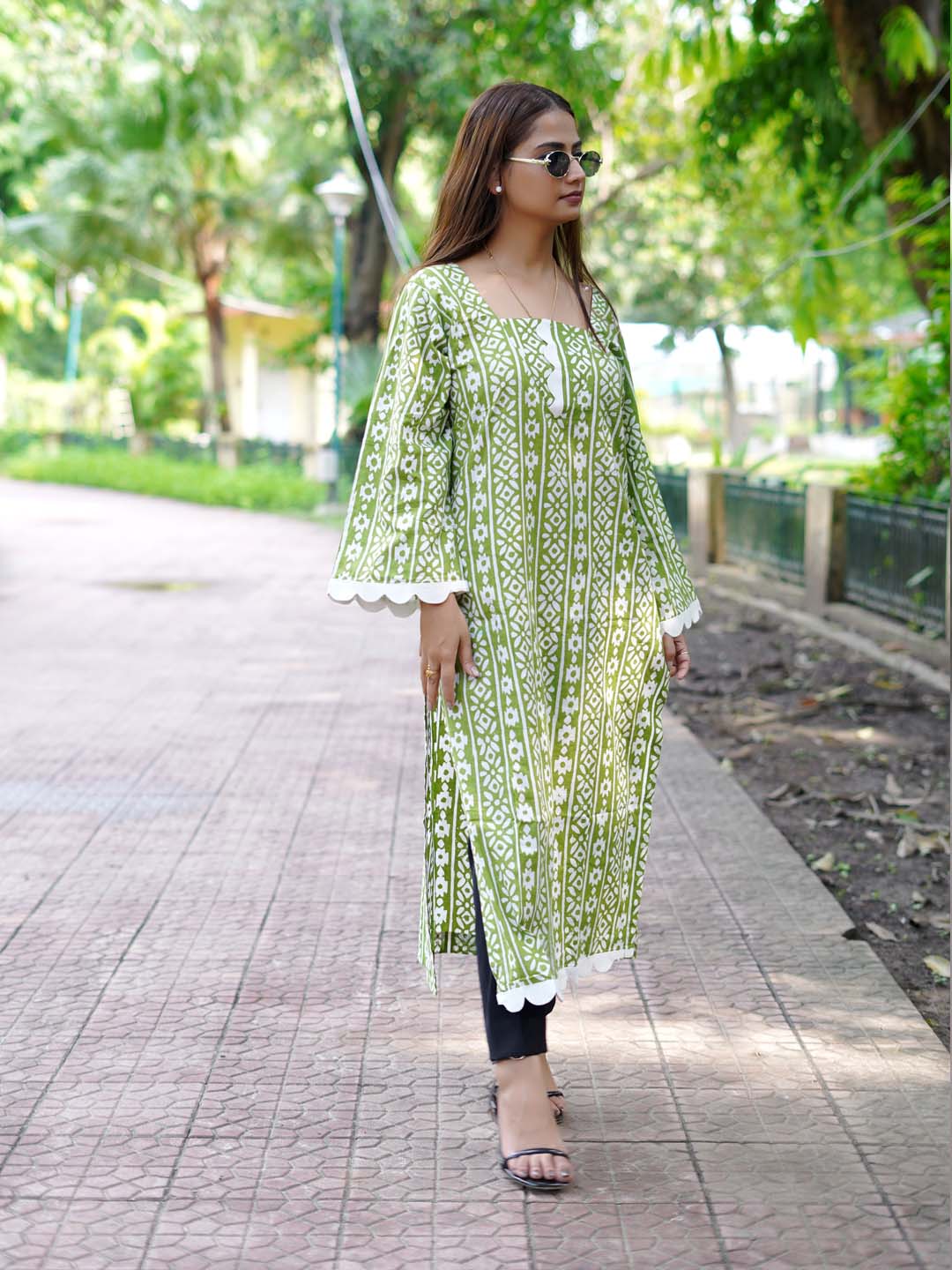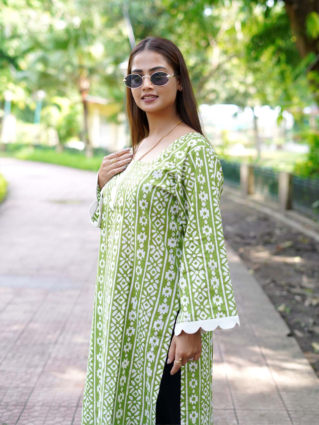 The Hania Kurti is a stylish and modern ethnic wear piece that blends comfort with elegance. Designed in a soothing long green shade, it features an intricate ekat-inspired print that adds a traditional charm to its contemporary silhouette.